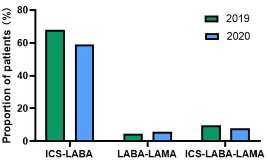 Proportion of patients with at least 1 combination inhaler. Abbreviations: LABA, long-acting β2-agonists; LAMA, long-acting muscarinic antagonists; ICS, inhaled corticosteroid.