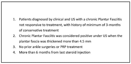 - Martinelli, N.; Marinozzi, A.; Carnì, S.; Trovato, U.; Bianchi, A.; Denaro, V. Platelet-rich plasma injections for chronic plantar fasciitis. Int. Orthop. 2013, 37, 839–842. [Google Scholar] [CrossRef] [PubMed]