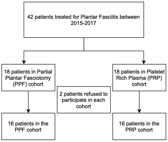 After approval from the local institutional review board, we performed a prospective cohort study from a single institution. From January 2015 to January 2017, patients were randomly divided into two groups consisting of 16 patients per group for each treatment modality. Patients in group one were treated with a PRP injection while patients in group two were treated with a partial plantar fasciotomy (PPF) surgery, with all procedures performed by a single foot and ankle fellowship-trained specialist surgeon. All the patients were briefed about the study’s randomization process and consented to the different procedures. Only after the patient was admitted to the hospital and before taking him to the operating room did the surgeon open a sealed envelope given by the research coordinator allocating the patient to one of the two procedures. A posthoc power analysis was performed to determine the appropriate sample size based on the change in Roles-Maudsley Scale (RM) from pretreatment to post-treatment time points. The RM scale is a subjective four-point assessment of pain and limitations of activity with 1 = excellent result with no symptoms following treatment and 4 = poor, symptoms identical or worse than pretreatment [13]. Inclusion criteria mandated that all patients would be diagnosed clinically for recurrent CPF following conservative treatment, which includes stretching, chiropractic therapy, strengthening, orthotics, and acupuncture for at least 3 months prior to the PRP treatment. Patients were excluded if they had been previously treated with local PRP injection for CPF, underwent previous ankle or foot surgery, received local steroids injection within the last six months, or had other foot pathologies such as fractures, arthritis, or bursitis (Figure 1). Additional exclusion criteria included patients diagnosed with CPF but failed to achieve a minimum of 3 months of conservative treatment and patients who encountered trauma after the treatment or were suspected of benefiting from secondary gain (i.e., active lawsuit). (Figure 2). The patient selection process is included (Figure 3).