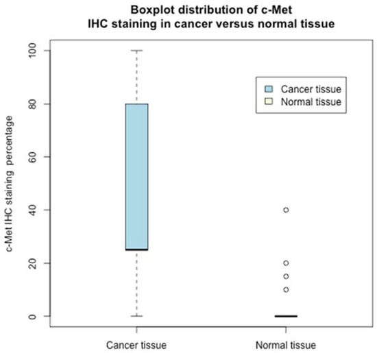 Boxplot distribution of c-Met IHC staining in cancer versus normal tissue.