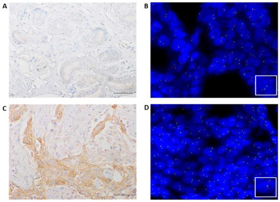 Representative results of MET IHC and FISH of a case analyzed in our series; (A) negative immunostaining of C-MET in a normal area (40× magnification); (B) MET FISH not amplified in a normal area, as indicated by two orange signals (MET) and two green (SE7) signals in each nucleus (60× magnification); (C) positive immunostaining of C-MET in a tumoral area (40× magnification); (D) MET FISH not amplified in a tumoral area as indicated by two orange signals (MET) and two green (SE7) signals in each nucleus (60× magnification).