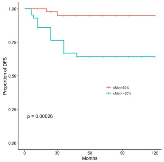 Kaplan-Meier estimates illustrating the DFS of patients by high c-MET (≥50%) and low c-MET (<50%) expression levels.
