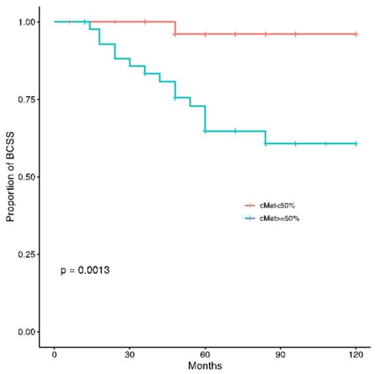 Kaplan-Meier estimates illustrating the BCSS of patients by high c-MET (≥50%) and low c-MET (<50%) expression levels.