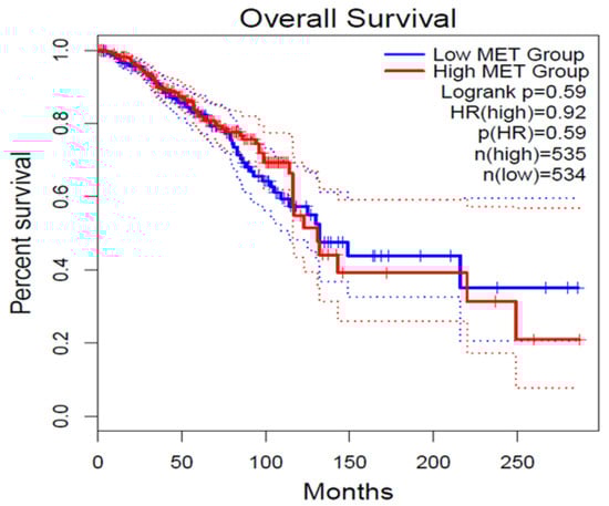 As per GEPIA2 survival analysis using existing clinical datasets from TCGA and GTEx, increased expression of c-Met RNA in BRCA clinical patients is associated with poor OS, even if this difference did not reach statistical significance (Figure 6). This in-silico analysis partially supports our experimental findings from IHC in ER+/HER2- resected breast cancer patients. In fact, this analysis correlates the expression of c-Met RNA and not of the Met protein as performed in our experimental model using immunohistochemical evaluation on paraffin-embedded BRCA tissues. Moreover, no information on the eventual correlation in the specific ER+/HER2- resected breast cancer patients can be derived from the currently available data set. On these bases, the diverse correlation observed in the GEPIA2 survival analysis could, therefore, be based on those pitfalls.
