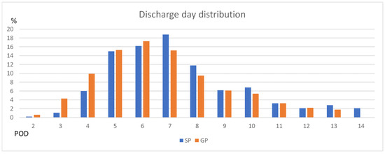 Histogram showing the distribution of postoperative hospital stay for the study population according to solo practice (SP) and group practice (GP). POD = postoperative day.