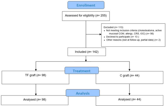 CONSORT 2010 Flow Diagram. Abbreviation: TF, temporalis fascia; C, Cartilage; COM, chronic otitis media; CRS, chronic rhinosinusitis; IOC, Impaired ossicular chain.