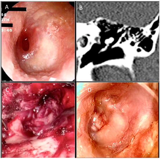 (A) Preoperative otoendoscopic image showing anterior perforation of the left tympanic membrane. Anterior wall of the procident duct. (B) CT scan in coronal section. (C) Intraoperative image of temporalis muscle fascia placed with Underlay technique. (D) Otoendoscopic follow-up at 6 months.