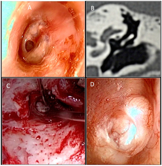 - Iannella, G.; De Vincentiis, M.; Greco, A.; Vicini, C.; De Vito, A.; Meccariello, G.; Cammaroto, G.; Pelucchi, S.; Magliulo, G. Endoscopic approach in second stage ossicular chain reconstruction. Am. J. Otolaryngol. 2019, 40, 735–742. [Google Scholar] [CrossRef] [PubMed]