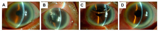 Air tamponade was performed at the split lamp in an examination room with all aseptic precautions. The patients’ intrapalpebral area was sterilized with drops of povidone-iodine solution. Patients sat in front of the slit lamp following topical anesthesia with proparacaine HCl (Alcaine®) ophthalmic solution (Alcon Lab., Inc., Fort Worth, TX, USA). A speculum was used to keep the eye open and a sterile cotton bud was applied to stabilize the eye. The entry site was in the area where DM was attached, as shown in the AS-OCT images. The major procedure of air tamponade consists of four steps. Step 1, a 30-gauge syringe needle was inserted from the limbus area into the anterior chamber (Figure 1A). Step 2, the syringe was retracted, and approximately 150 µL of aqueous humor was suctioned subsequently (Figure 1B). Step 3, a new sterile syringe prefilled with air was inserted from the same needle entry site, and the aseptic air was injected to fill up to approximately two-thirds of the total anterior chamber volume (Figure 1C). The last step involved pulling the syringe needle from the cornea (Figure 1D). The procedure was completed by the main operator (NL) and assistant (GY). Ten minutes after the procedure, IOP was measured by no-contact tonometer (Topcon, Japan). The patient was asked to stay supine for two hours and then as much as reasonably possible to allow the air bubble to press DM to the posterior corneal stroma. All patients had the importance of a supine position during the postoperative stage explained to them. All patients received a standard postoperative regimen consisting of prednisolone acetate 1% eye drops six times a day and topical ofloxacin 0.3% eye drops four times a day for one week. After a week, the topical antibiotic was stopped and corticosteroid eye drops were tapered over the subsequent month.