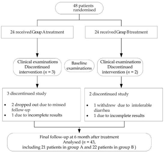 Of the 48 patients, 43 completed the follow-up, including 21 patients in Group A and 22 patients in Group B. Two dropped out due to incomplete results (one case in Group A and one case in Group B), who only participated in the first visit and did not come back for follow-up visit, two dropped out due to missed follow-up in Group A for personal reasons, and one dropped out of the study due to intolerable diarrhea in Group B, as shown in Figure 1. In this study, the research objects of modified ITT (mIITT) and PP were the same. The area most often affected by lesions was the buccal mucosa, either as a single site or accompanied by lesions in the gingiva, tongue, lip, palate, and other sites. There were no statistically significant differences in the gender, age, type, location, and other basic information between the patients of Groups A and B (Table 1).