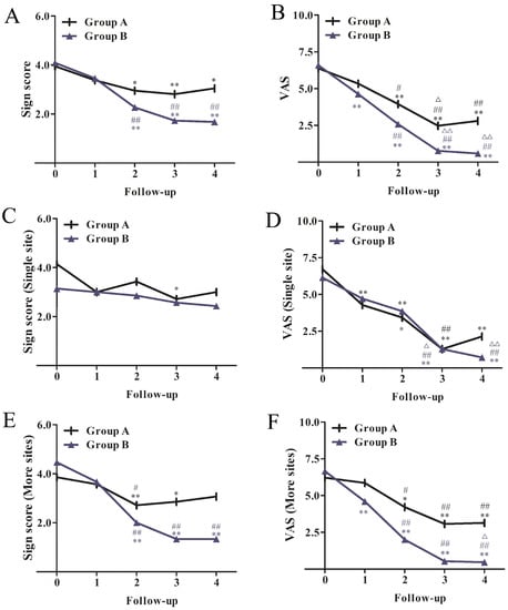 Sign score and VAS trends before and after treatment and during follow-up in each group. (A,C,E) Sign score of all patients (A), patients with a single site of mucosal involvement (C), patients with more than one site of mucosal involvement (E) in Group A and B, (B,D,F) VAS of all patients (B), patients with a single site of mucosal involvement (D), patients with more than one site of mucosal involvement (F) in Group A and B. * Compared with baseline, * p < 0.05, ** p < 0.01, # compared with the 1st follow-up, # p < 0.05, ## p < 0.01, Δ compared with the 2nd follow-up, Δ p < 0.05, ΔΔ p < 0.01.