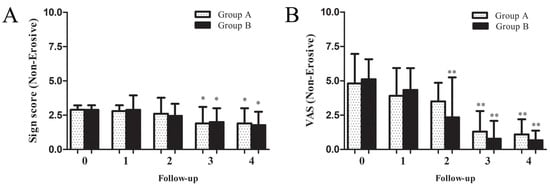 Sign score (A) and VAS (B) trends before and after treatment of patients with non-erosive OLP in Group A using dexamethasone plus gentamycin mouthwash and Group B by dexamethasone plus gentamycin mouthwash combined with TGP capsules. * Compared with initial visit, * p < 0.05, ** p < 0.01.
