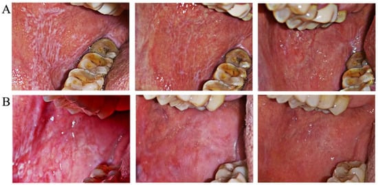 Magnitude of clinical responses of non-erosive OLP to dexamethasone plus gentamycin mouthwash (A) and dexamethasone plus gentamycin mouthwash combined with TGP capsules (B). The left panel is the clinical presentation at the initial baseline, the middle panel is the clinical presentation at the 1-month follow-up, indicating improved white lesions, and the right panel is the clinical presentation at the 6-month follow-up, when only a few white lesions remained (upper, Group A) or they had disappeared (upper, Group B).