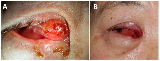 Extraocular manifestations. (A) Clinical features during the first visit to our hospital. Salmon-colored mass in the right inner canthus and external deviation of the eyeball. This was accompanied by a small amount of purulent discharge and superficial ulceration. (B) Before the operation and removal of the surface discharge.