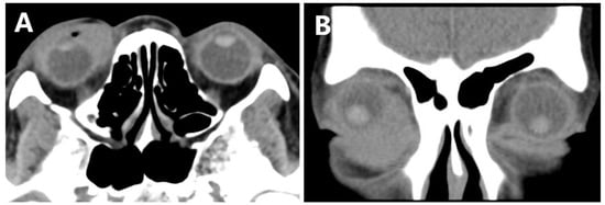 CT scan of the orbits. The mass was located in the right medial orbital, and there was no sign of nasal infiltration. Equal to soft tissue density. (A) Horizontal view. (B) Coronal view.