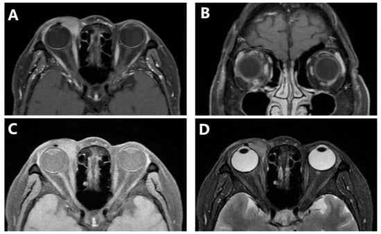 An MRI scan of the orbits showed a mass of irregular shape that appeared isointense on TI-weighted sequences located in the right medial orbital. (A) Horizontal view of contrast-enhanced TI-weighted fat-depressed sequences. (B) Coronal view on contrast-enhanced TI-weighted sequences. (C) Horizontal view of TI-weighted fat-depressed sequences. (D) Horizontal view of T2-weighted fat-depressed sequences.