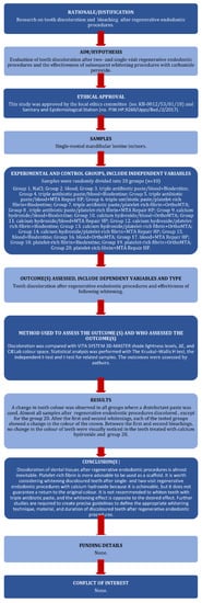- Nagendrababu, V.; Murray, P.E.; Ordinola-Zapata, R.; Peters, O.A.; Rôças, I.N.; Siqueira, J.F., Jr.; Priya, E.; Jayaraman, J.; Pulikkotil, S.J.; Camilleri, J.; et al. PRILE 2021 guidelines for reporting laboratory studies in Endodontology: A consensus-based development. Int. Endod. J. 2021, 54, 1482–1490. [Google Scholar] [CrossRef] [PubMed]