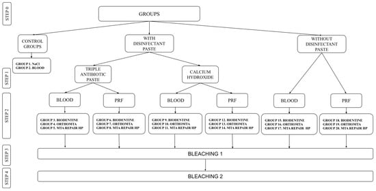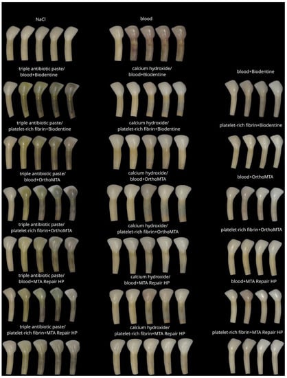 After the extraction of 230 teeth, the specimens were stored in 1% chloramine solution for 24 h at 22 °C. All teeth were cleaned of plaque, sediment and stains using an ultrasonic scaler, and polished with water and pumice paste. Thirty teeth were excluded because of dental abnormalities or caries. Two-hundred teeth were included in the study and prepared for further research, similar to Shokouhinejad et al.’s study []. Endodontic access was prepared, and the pulp was removed from the pulp chambers and root canals using a barbed broach. To simulate immature teeth and standardise the length of the roots, the apical part of the root was removed 15 mm from the cementoenamel junction with a diamond bur in a high-speed hand piece under water cooling, and 4 mm of the apical part was sealed with glass ionomer cement (Kromoglass 2, LASCOD, Sesto Fiorentino, Italy). The root canals were shaped using 1#–6# Gates Glidden drills. The canals were irrigated with 1.5% NaOCl (20 mL/5 min), followed by 17% ethylenediaminetetraacetic acid (EDTA) (20 mL/5 min) and dried with absorbent paper points. The teeth were randomly divided into 20 groups (n = 10) (Figure 2). Two of the groups were control groups in which the root canals were filled with 0.9% NaCl (group 1) or blood (group 2). The internal walls of the pulp chambers of the remaining specimens were sealed with a dentin bonding agent (Tokuyama Universal Bond, Tokuyama Dental, Tokyo, Japan), according to the manufacturer’s instructions.