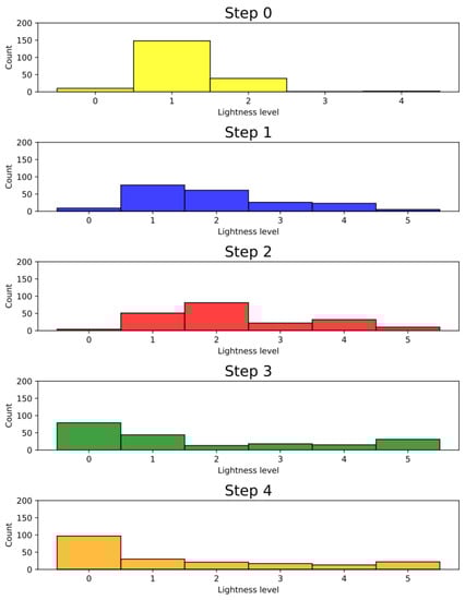 Step 0 corresponds to the samples without any interference. In the qualitative analysis, most teeth were defined as lightness level 1 (Figure 3). The means and standard deviations for the values of L, a, and b are presented in Table 4.