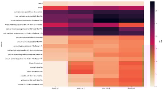 In the second step of this study, the colour of the teeth was evaluated 4 weeks after the scaffold (e.g., blood or platelet-rich fibrin) and barrier material (e.g., Biodentine, OrthoMTA or MTA Repair HP) applications. After this time, only group 20 showed no visible colour change (∆E = 2.62). ΔE values between steps 1 and 2 in the groups 3–8 were the highest and did not differ significantly between the groups. This finding is in line with the results presented by Shokouhinejad et al. [], who observed that after replacing triple antibiotic paste with blood and barrier material, the teeth did not differ significantly between the groups. In all triple antibiotic paste groups, the L value decreased significantly and the teeth became darker in the second step, when compared to the first step. The lowest ∆E value in step 2 was observed in the groups 18–20. Out of these three groups, group 19 has the highest ∆E value. This may be due to the presence of bismuth oxide in OrthoMTA. Bismuth oxide is used as a radiopacifier and is associated with discolouration of dental tissues [,,]. Oxidising agents, such as the amino acids present in dentin collagen or sodium hypochlorite, in contact with bismuth oxide destabilise it, which is associated with discolouration [,]. For the single-visit regenerative endodontic procedures groups, groups 15–17 showed more discolouration than the corresponding platelet-rich fibrin groups between step 1 and 2. Additionally, the results for groups 15–17 were not significantly different when compared to group 2. Based on these results, it can be concluded that blood has a greater staining potential than platelet-rich fibrin, regardless of the barrier material. Blood discolouration may be caused by the penetration of erythrocyte pigments into tooth tissues and the accumulation of decomposition products in the dentinal tubules []. The factor that increases ΔE may be the absorption of blood components by the freshly applied and unset barrier material []. Namazikhah et al. [] noticed porosities in the microstructure of calcium silicate-based cement, which may take up blood components and cause discolouration of the material, and thus tooth discolouration []. The absence of erythrocytes in platelet-rich fibrin may be the cause of the decreased discolouration potential of platelet derivatives []. This result is in agreement with that reported by Shokouhinejad et al. [], who found that the groups treated with blood showed more discolouration than the platelet-rich fibrin groups after 1 month. The difference between the studies was that Shokouhinejad et al. [] used a double antibiotic paste that consisted of ciprofloxacin and metronidazole, but after 4 weeks, there was no visible change in tooth colour (ΔE ≤ 3.3). Statistical significance was noted in the triple antibiotic paste groups, in which platelet-rich fibrin was used as a scaffold, compared with the corresponding calcium hydroxide and single-visit regenerative endodontic procedures groups. This is due to the strong staining potential of triple antibiotic paste and the inability to completely rinse out the triple antibiotic paste, which means that it remains in the dentinal tubules [] and could affect the colour changes in the tooth tissues. When comparing the triple antibiotic paste group, in which blood was applied as a scaffold, with the corresponding calcium hydroxide and single-visit regenerative endodontic procedures groups, the authors noticed that ∆E was higher in the triple antibiotic paste group, but it did not change significantly. The authors concluded that there may be a possible interfering effect of the triple antibiotic paste and blood staining potential due to a significant change in ∆E in the groups with platelet-rich fibrin when triple antibiotic paste was applied, but the difference was not significant in groups where blood was used. When comparing the colour change in the calcium hydroxide groups with the corresponding single-visit regenerative endodontic procedures groups, there was no statistical differences between steps 1 and 2; thus, it could be concluded that calcium hydroxide had no effect on further discolouration in step 2.