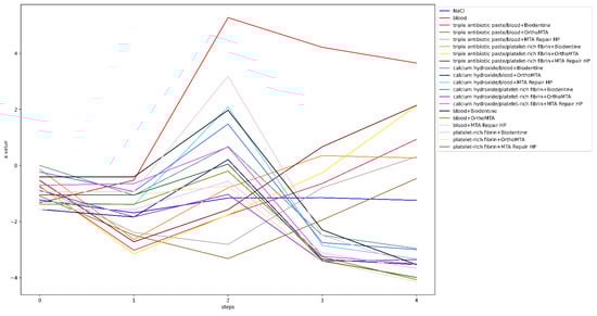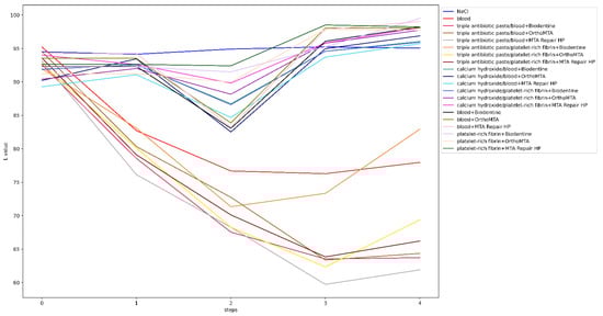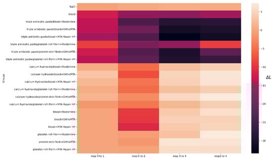 In the third and fourth steps of this study, the colour of the teeth was evaluated 1 week after the application of the bleaching material, which was applied twice. A 15% carbamide peroxide gel was selected for the study, which releases 5.25% hydrogen peroxide and urea [] and is in line with the General Dental Council’s Position Statement on Tooth Whitening [], assuming that regenerative techniques are most often conducted in children. Compared with other bleaching agents, carbamide peroxide is less cytotoxic to human dental pulp stem cells []. In the qualitative analysis, most of the teeth were defined as lightness level 0 in steps 3 and 4. Additionally, there were samples with lightness level 5 in step 1 (after disinfectant paste application), and their number increased in the following steps. Comparing steps 3 and 4 to step 0, in which most of the teeth were defined as lightness level 1, the authors concluded that after the first and second whitening procedures, the teeth did not return to their original colour. Most of the samples whitened too intensely, while some darkened. When analysing individual colour components, such as L, a, and b (Figure 6, Figure 7 and Figure 8), it was noticed that in the groups with triple antibiotic paste, the values of L and b decreased, whereas the value of a increased, which may mean that after the second whitening procedure, the teeth became darker, redder, and less yellow than the original colour. Based on a comparison of the brightness of the teeth colour before treatment and after the second whitening procedure, we concluded that in the groups with calcium hydroxide and single-visit regenerative endodontic procedures groups, the teeth became brighter, whereas in the triple antibiotic paste groups, the teeth became darker (Figure 5 and Figure 6). The results for the single-visit regenerative endodontic procedures groups were in line with those of Khedmat et al.’s study [], which showed that the ΔL value increased after the second bleaching session in specimens in which blood and OrthoMTA were applied. The difference between the studies was the concentration of the bleaching agent, as Khedmat et al. [] used 37% carbamide peroxide. The authors did not notice any visible (ΔE < 3.3) or statistically significant (p > 0.005) differences in the colour change in the tooth crown for any of the groups where calcium hydroxide was used, including group 20, between the first and second whitening procedure, which may mean that one whitening session is sufficient with this combination. In the remaining single-visit regenerative endodontic procedures groups, ΔE between steps 0 and 3 and steps 0 and 4 increased, suggesting an unfavourable whitening effect by increasing the colour change from the original colour.