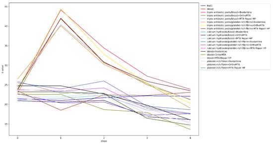 In step 1, visible tooth discolouration was observed in all groups in which the disinfectant pastes were applied. The mean value of ∆E for the groups with calcium hydroxide was 4.27, and for the groups with triple antibiotic paste, ∆E = 23.13. Significant differences in ∆E were found between the calcium hydroxide groups, triple antibiotic paste groups, and groups where the disinfectant pastes were omitted, but not within the groups themselves. Figure 10 shows the samples arranged in the first step in the three-dimensional CIELab colour space.