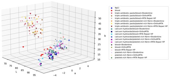 Three-dimensional scatter plot in the CIELab colour space (L, a, and b coordinates) of mean colour distribution of the groups after applying the disinfectant paste.