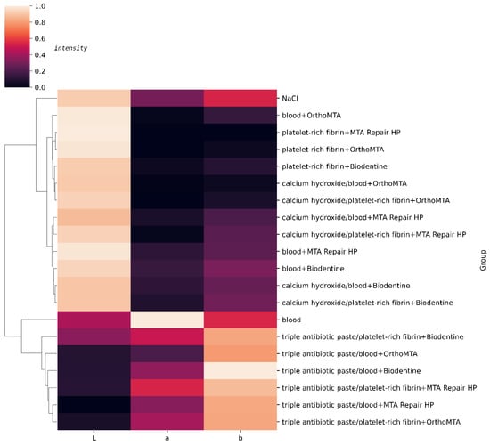 Statistical analyses were performed using NumPy [], SciPy [], Pandas [], and Scikit-learn [] libraries for the Python programming language. Graphs were generated using the Matplotlib [] and Seaborn [] Python libraries. Basic statistical descriptive tests were performed, and data are presented as the mean and standard deviation. The Kruskal–Wallis H test was used to evaluate the qualitative results from the VITA SYSTEM 3D-MASTER shade lightness levels. The independent t-test and t-test for related samples were used to compare the numerical values between the groups and steps in the quantitative analysis. Hierarchical clustering was performed using the Ward method with Euclidean affinity. A statistically significant test result threshold was set at p < 0.005 [].