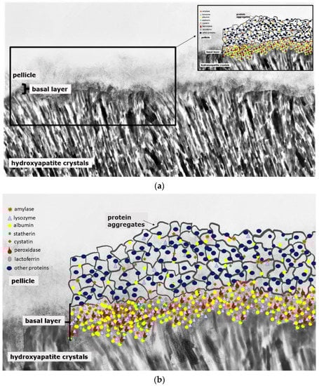 The adsorption processes change the secondary and tertiary structure of the pellicle enzymes and proteins []. As soon as they are immobilized in the pellicle layers, the active center underlies changes. Nevertheless, these enzymes and proteins are still in an active conformation inside the pellicle layers [,]. It is known that the pellicles’ precursor proteins are the most protective ones against erosive demineralization []. These proteins are, e.g., PRPs, cystatins, amylase, lactoferrin and histatins. Carvalho et al. assume that an increase in proteins with high affinity to hydroxyapatite in the pellicle’s basal layer could also lead to an increase in proteins binding to the pellicle’s precursor proteins [].
