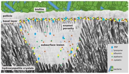 PRP, statherin and cystatin, especially, are the proteins that are responsible for mineral homeostasis and binding to calcium-phosphates of hydroxyapatite. Therefore, it is necessary to evaluate the specific role of these important key player proteins in the caries’ developmental process in further studies. Schweigel et al. examined the proteome of the acquired salivary pellicle and saliva in general. Regarding their physico-chemical properties, they did not differ much []. Interestingly, molecular size distribution especially varied clearly. Thereby, pellicle proteins were significantly smaller and shorter than salivary proteins []. This size distribution is a crucial factor in terms of process regulations such as caries initiation and progression. Especially with regard to the affinity of proteins to the enamel surface, a higher level of phosphorylation and glycosylation was observed in pellicle proteins []. Moreover, pellicle proteins showed a higher buffer capacity in very acidic environments []. Consequently, these pellicle proteins are able to protect the hydroxyapatite surface against acidic attacks by an increased ionic interaction strength, and, due to their small size, they can diffuse easily through the enlarging size of the porous enamel structure of developing carious lesions (Figure 2) []. Salivary proteins do not need these properties. The salivary buffering capacity is maintained through soluble salivary ions []. Salivary proteins need protection against denaturation and decreased affinity to enamel surfaces, which is maintained by larger scale salivary proteins [].