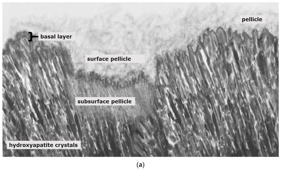 Caries and erosive mineral loss are still highly prevalent pathological processes in dentistry []. Modern concepts in conservative dentistry aim at remineralization and consolidation of such lesions; invasive therapy with fillings should be avoided or at least delayed []. Prerequisites for this approach are highly sensitive diagnostic techniques for the detection and monitoring of initial lesions as well as effective preventive agents and a profound understanding of the processes occurring at the surface and in subsurface layers at a nanoscopic level []. At first glance, it seems as if these topics have been explored completely and are the content of textbooks. A closer look at different aspects indicates that several key features are still not fully understood. This applies especially for the interactions of organic and inorganic structures directly underneath the surface. The following literature search was conducted using the PubMed and Medline databases as well as Google Scholar. Due to the unique conditions in the oral cavity, in vivo or in situ studies were mainly included in the review. In vitro data were considered if the experiments provided essential information on mineralization processes. This applied especially for methodical approaches not applicable in situ or in vivo, respectively. Bioadhesion and surface interactions on dental enamel are of essential relevance for initiation, progression, consolidation and prevention of caries and dental erosions. Salivary proteins on and within initial carious and erosive lesions can facilitate or aggravate de- and remineralization [,]. This applies for the pellicle layer (Figure 1), for proteins within initial carious lesions (Figure 2) and for the subsurface pellicle in superficially demineralized enamel (Figure 3). Despite this fact, little is known about the composition, function and ultrastructure of these proteinaceous structures related to initial caries and erosion.