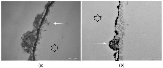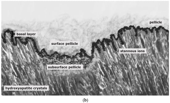 Stannous fluoride, thereby, has two characteristics: On the one side, it facilitates the fluoride adsorption and thus improves enamel remineralization and stops demineralization []. On the other side, stannous ions are able to inhibit plaque acidogenicity by interrupting membrane transport systems and enzymes that are involved in glycosidic pathways []. The uptake of stannous ions into bacterial cells changes bacterial growth and the bacterial metabolism leading to cell death after integration of the ions [,,]. For a long time, the impact of stannous fluoride on initial bacterial colonization referred to two older studies [,]. Current TEM-investigations have shown that stannous ions appear to enhance the pellicle’s resistance against bacterial colonization and acidic dissolution in 8-h and 30-min in situ pellicle samples after rinsing with stannous fluoride and stannous chloride [,]. Thereby, the basic layer of the 30-min and 8-h in situ pellicle revealed, in part, a higher electron density with a verifiable accumulation of stannous-compounds that also persisted after incubation in HCl (Figure 3b) [,].