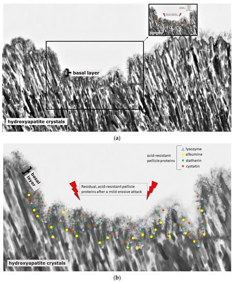 The acquired pellicle is formed after contact of the tooth surfaces with saliva and protects the tooth surfaces against acidic challenges. Thereby, the pellicle’s basal layer shows physiological protective properties towards acids by preventing a direct contact between acids and the tooth surfaces []. The pellicles’ protein network acts as a mechanical barrier against acidic influences and prevents the tooth from dissolution of calcium and phosphate ions [,,]. Some pellicle components, such as cystatin B, are increased up to 20-fold after acidic challenges (citric acid; pH 2.5) []. Thereby, the pellicle acts as a modulating factor, aggravating and reducing the calcium and phosphate dissolution []. The thicker the pellicle layer, the more protection is detectable against demineralization [,]. The electron-dense basal layer of the pellicle yields the highest protection against acid attacks []. The exterior pellicle layers are of lower density and provide less protection [].