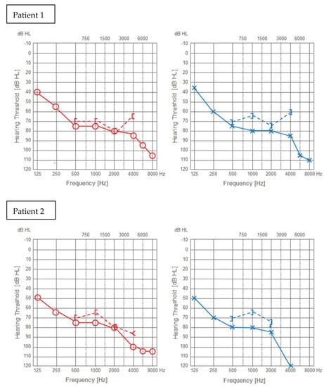 This prospective, pilot study included two adult patients (females, aged 57 and 61 years) who underwent cochlear implantation in a tertiary referral center. Robot-assisted cochlear implantations were performed on 12–13 July 2022. The surgeries were preceded by surgical training on an artificial temporal bone (Figure 1). The patients had passed the typical procedure for qualifying for a cochlear implant at our center before surgery. Both patients had residual hearing in the implanted ear (Figure 2). The preoperative CT of the temporal bone (Siemens, Somatom Definition Edge, Munich, Germany) showed normal anatomy of the ear qualified for cochlear implantation in the both cases (case 1–right ear, case 2–left ear) (Figure 3). The patients provided informed, written consent for their participation in the study and the publication of its findings. The study was approved by the local Bioethics Committee (decision number 1033/19).
