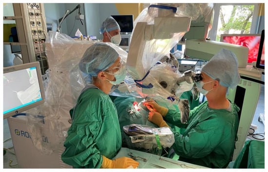 Robotics in otology has overtaken other fields of head and neck surgery and has been developing in many directions for more than two decades. Robots for otology can be classified as collaborative when intervention is constrained by the robot but the surgeon directly actuates the end-effector, teleoperated when a remotely controlled robot enables the tremor reduction, or autonomous when the surgeon monitors the robot performing a task [1,2,3]. Current clinical trials focus on more accurate stapes surgery, minimally invasive access to the cochlea and less traumatic insertion of cochlear implant (CI) electrode arrays. A robot-based holder may combine the benefits of endoscopic exposure with a two-handed technique. Robot-assisted endoscopy is a safe and trustworthy tool for several categories of middle ear procedures, such as myringoplasty, partial ossiculoplasty and total ossiculoplasty [4,5]. Robot-assisted manipulation of the ossicular chain in cadaveric temporal bones using a robotic arm (RobOtol®) was described as reliable [6]. Otosclerosis surgery with robotic assistance enhances the precise amplitude of motion and the surgeon’s dexterity and rapidly reduces the learning curve [7]. Moreover, the surgical simulator has been developed to plan new procedures that exploit the robot`s capacities, enhancing gesture accuracy and allowing exploration of new procedures for middle ear surgery [8].