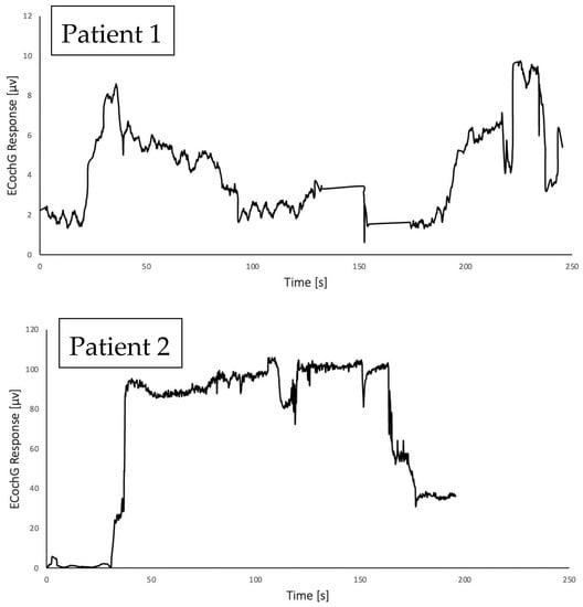 The intraoperative ECochG response measurements for patient 1 and patient 2.