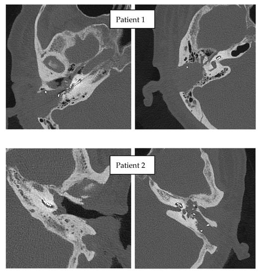 The post-operative CT confirmed the intracochlear position of the electrode arrays (with the tip of the electrode array in the medial turn of the cochlea) in both patients (Figure 9).