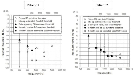 The results of pure tone audiometry and the estimated audiograms are presented in Figure 10. Preoperative BC thresholds compared to intraoperative estimated ECochG thresholds and 2-day postoperative BC thresholds had similar values at frequencies where all thresholds were measurable. However, for patient 1 the estimated threshold for 250 Hz seems an outlier (80 dB HL vs. 55 and 50 dB HL). The results of the ECochG performed one month after the surgery showed that in both patients the hearing residues were preserved for the selected frequencies. Moreover, in patient 2, the pure-tone audiometry results confirmed the maintenance of postoperative auditory thresholds for most frequencies.