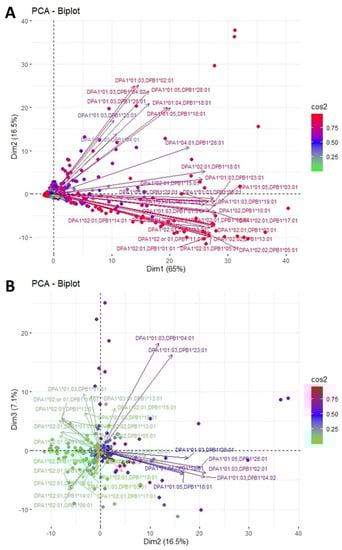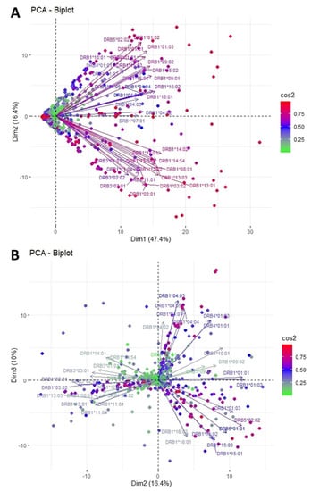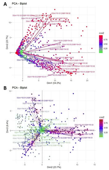 PCA biplot projections of anti-HLA-DP responses. (A) Projection of the first and second eigenvectors of the covariance matrix. (B) Projection of the second and third eigenvectors of the covariance matrix. Each arrow represents a specific anti-HLA-DR reaction, while each point indicates individual reactions. Colors of loadings and points represent the cos2 value of the explained variance for variables and individuals, respectively.