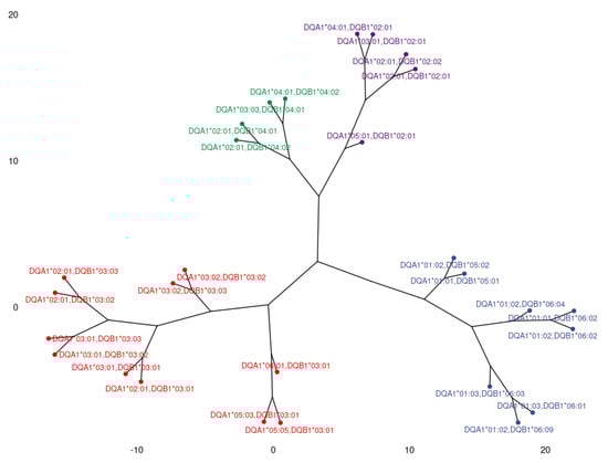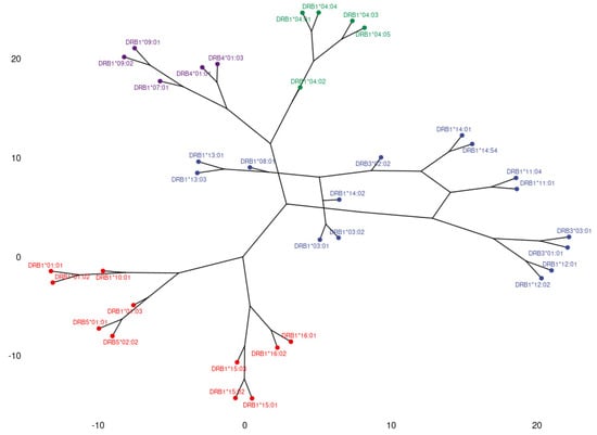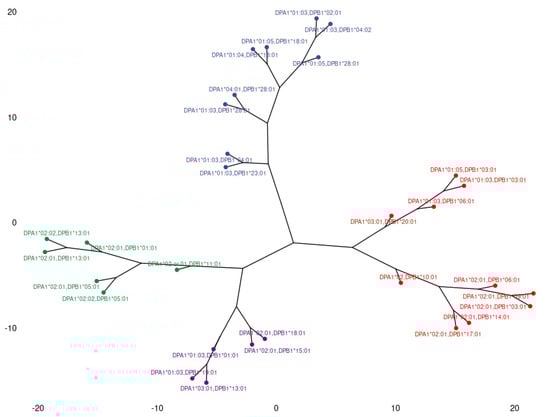 In order to explain the formation of clusters of HLA class II alleles, we defined common epitopes present exclusively in each of the formed clusters. Information on epitopes present in each allele, as well as the ElliPro scores, came from the HLA Epitope Registry [https://epregistry.com.br/ (accessed on 1 October 2022)], version 3.0, DRB, DQ, DP databases, Luminex alleles [].