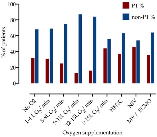 Next, we examined the association of PT with a level of respiratory support. Patients were divided into subgroups according to oxygen supplementation during hospitalization, as presented in Table 2 and Figure 1. The highest frequency of PT was observed among patients requiring more than 15 L of O2/min (44% in patients on 15–25 L of O2 on mask with reservoir, 37% in HFNC and 46% on NIV, 34% in IMV or ECMO).