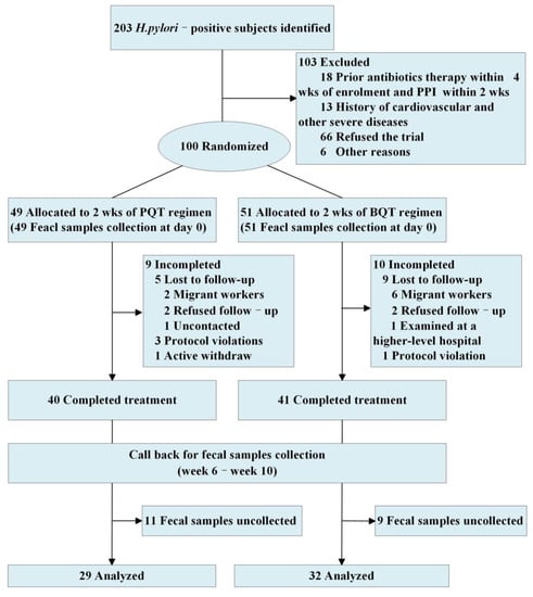This study was a randomized clinical trial following the CONSORT guidelines. The study design was previously published [30]. One hundred asymptomatic adults aged 40 to 69 years were enrolled at Yanting Cancer Hospital from December 2019 to August 2020. Diagnosis of H. pylori infection was by 14C-urea breath test(14C-UBT). Subjects were enrolled according to the inclusion and exclusion criteria (Supplementary Materials) and were given a 14-day quadruple anti-H. pylori treatment, either the PQT group (esomeprazole 20 mg, amoxicillin 1 g, clarithromycin 500 mg, polaprezinc 75 mg, twice daily) or the BQT group (esomeprazole 20 mg, amoxicillin 1 g, clarithromycin 500 mg, bismuth potassium citrate 220 mg, twice daily). The subjects were randomly allocated (1:1) to the two groups using a computer-generated random sequence. Allocation was concealed in opaque envelopes until the beginning of the intervention. Self-reported gastrointestinal symptoms were evaluated on day 7 and day 14 of the medication. All subjects received a second 14C-UBT (to confirm the eradication efficacy), a physical examination, an endoscopic examination, and fecal sample collection four to eight weeks after treatment. All subjects were offered informed consent. All subjects were not allowed to take any drugs that affect the flora during the trial. This study was approved by the Ethics Committee of Sichuan Cancer Hospital and was registered at the Chinese Clinical Trial Registry (ChiCTR1900025800, 9 September 2019). All methods were carried out in accordance with relevant guidelines and regulations.