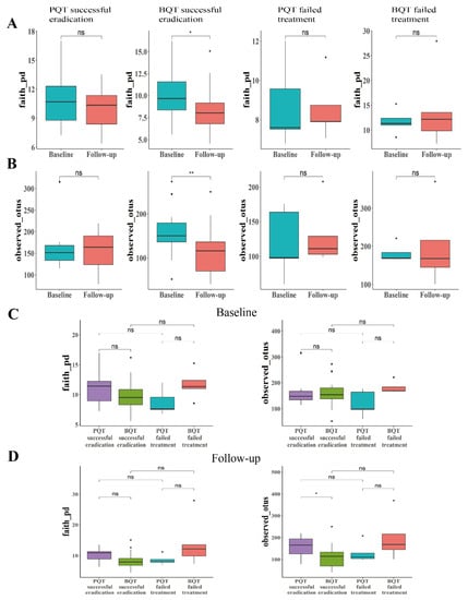 The median follow-up time interval was 35 (29–53) days for the PQT group and 43 (34–53) days for the BQT group, with no significant difference (p = 0.22). Shannon’s diversity, Pielou’s evenness, observed_otus, and Faith’s phylogenetic diversity indices of the paired samples for the four subgroups (PQT successful eradication group, BQT successful eradication group, PQT failed treatment group, and the BQT failed treatment group) are shown in Figure 2 and Figure S1 (in Supplementary Materials). Compared with the baseline, the alpha diversity significantly decreased in the subjects who were successfully eradicated by BQT (p < 0.05). Compared with the baseline, there was no statistical difference in the subjects who failed to be eradicated by either the PQT or the BQT treatment, as well as those who were successfully eradicated by PQT (Figure 2A,B and Figure S1 in Supplementary Materials) (p > 0.05). At follow-up, the alpha diversity indices among successfully eradicated subjects by BQT were significantly lower than those of PQT (Figure 2C,D and Figure S1 in Supplementary Materials) (p < 0.05).