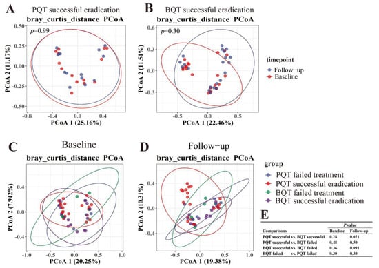 Comparisons of beta diversities. Beta diversity (PCoA) was compared with the baseline in PQT successful eradication group (A) and BQT successful eradication group (B). Beta diversity was compared among the four groups at baseline (C) and follow-up (D). (E): p-adjusted values of the multiple comparisons. PQT, polaprezinc-containing therapy; BQT, bismuth-containing therapy.