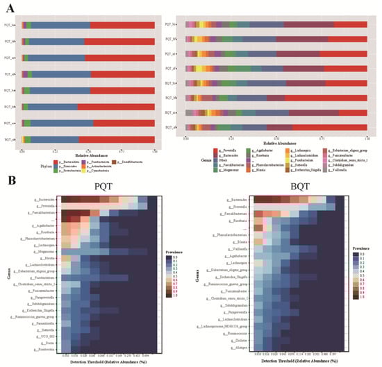 Taxa difference in gut microbiota between the PQT and BQT groups. (A) The relative abundance changes of phylum and genus in different groups. (B) The core microbiota composition between the PQT and BQT after treatment.