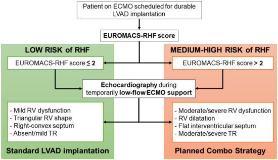 To date, right heart failure (RHF) complicates more than 40% of left ventricular assist device (LVAD) implantations in patients on extracorporeal membrane oxygenation (ECMO) support [1], quadruplicating early mortality [2,3], especially when an unplanned right ventricular assist device (RVAD) is required [4]. The need for a postoperative RVAD affects even long-term prognosis dramatically, both in terms of survival and freedom from RHF recurrence [4]. Moreover, the persistence of RHF 3 months after LVAD implantation has been demonstrated to negatively influence the 2-year survival of patients in the recent analysis of the Society of Thoracic Surgeons/Interagency Registry for Mechanically Assisted Circulatory Support (STS/INTERMACS) Database [5].