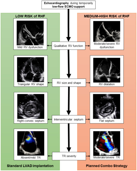 Firstly, the EUROMACS (European Registry for Patients with Mechanical Circulatory Support) Right-Sided Heart Failure Risk Score was calculated [10], to initially distinguish between low risk (score ≤2) and medium–high risk (score >2) of RHF. Since the reliability of this score has been demonstrated to improve when associated with a more detailed evaluation of RV performance [6], we meticulously assessed RV ventricular function, shape, and dimensions through echocardiography during temporarily reduced ECMO support. Figure 2 shows whether exemplificative echocardiographic images of RV function support the use of the Planned Combo Strategy.