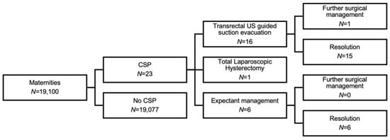In our unit, the estimated incidence of CSP was 1.2 in 1000 (23/19,1000) maternities. Figure 2 illustrates the CSP cases and subsequent clinical management.