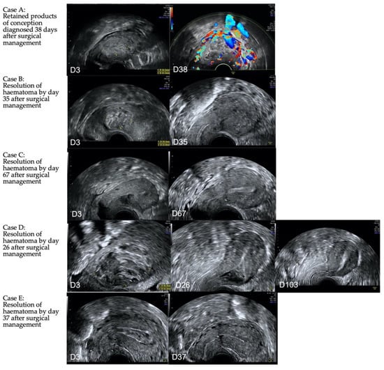 Longitudinal ultrasound images of five cases (case A–E) managed surgically with cerclage and balloon. The initial image was obtained on day 3 (D3) at the time of cerclage removal, and subsequent images are obtained between day 26 and 103 post surgical management. In 4/5 the haematoma present on day 3 resolves, whereas in one (A), retained products of conception is diagnosed at day 38 post surgery.