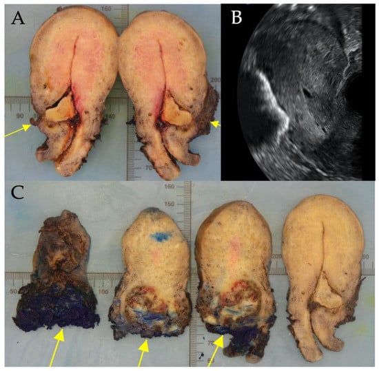 (A) Vertically transected hysterectomy specimen with trophoblast in the uterine niche measuring 20 × 15 mm2. (B) B-mode sagittal view of the uterus correlating with (A). (C) Hysterectomy specimen with a blue inked appearance illustrating perforation of the left uterine isthmus by trophoblast measuring 56 × 44 mm2. Photograph by Dr. Maria Rosario Oliviera Diz.
